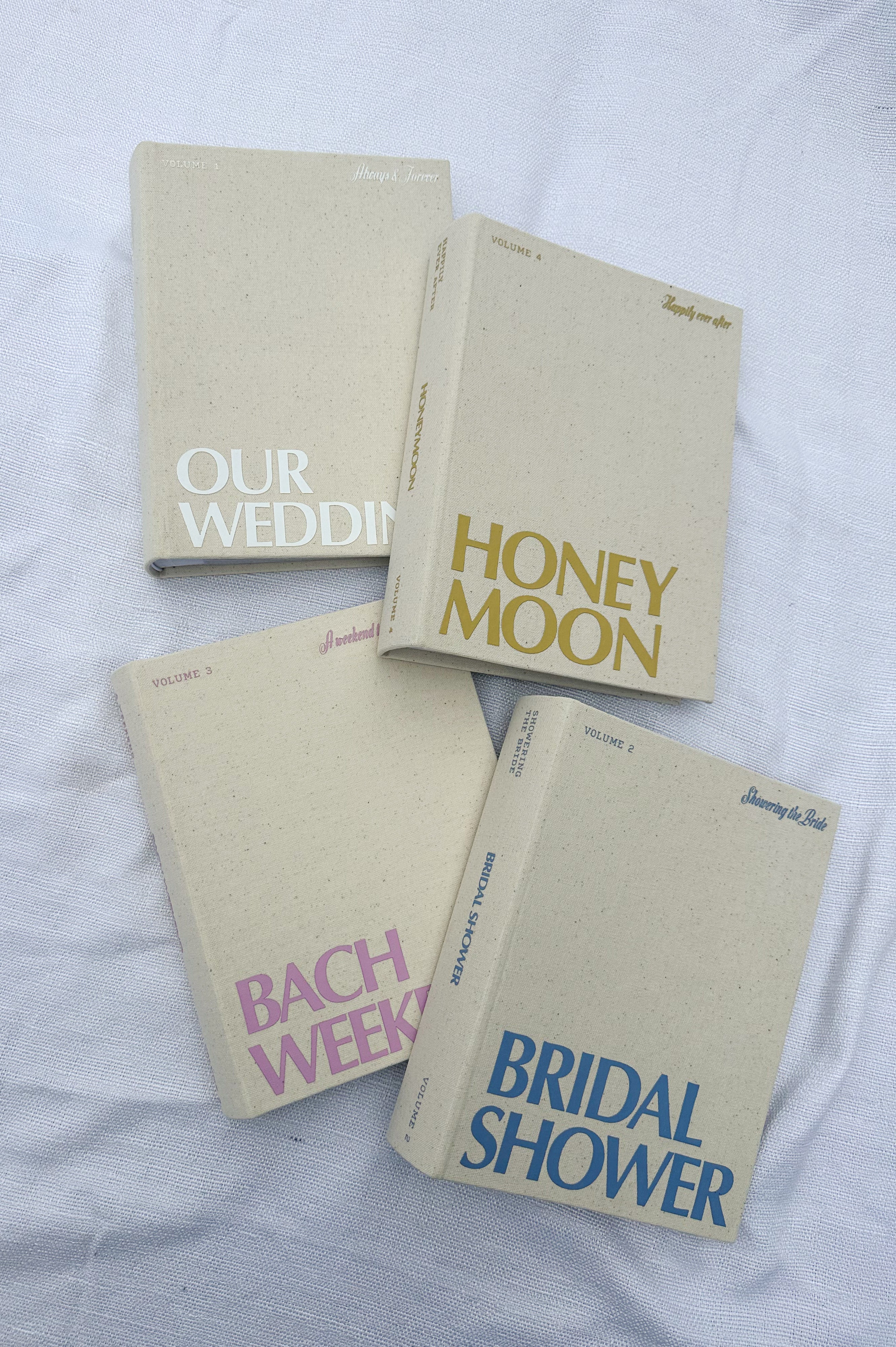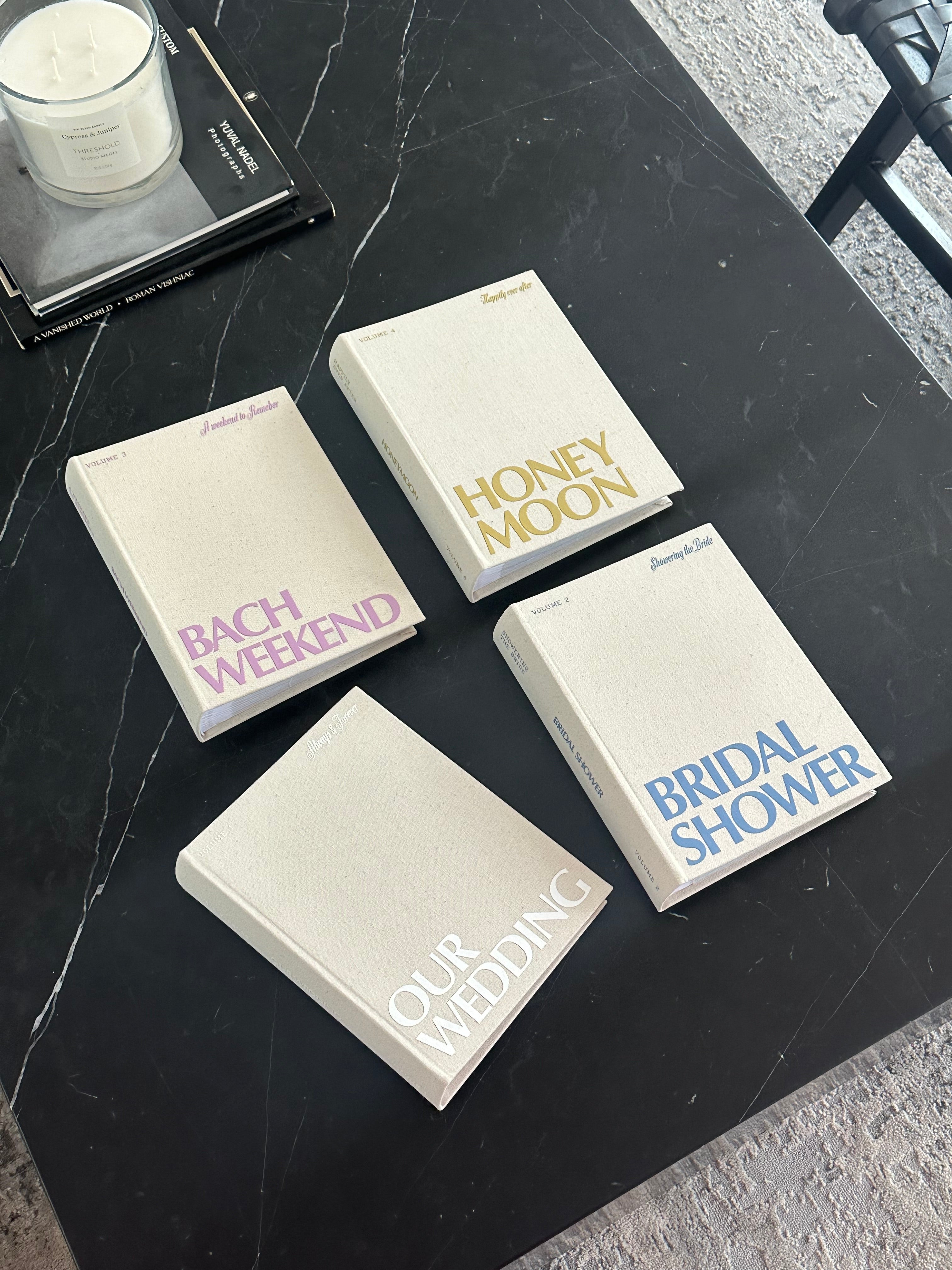 Our Photo Album Bundle comes with our four photo albums: Honeymoon, Wedding, Bachelorette Weekend, and Bridal Shower! You can purchase the entire collection at a discounted price!