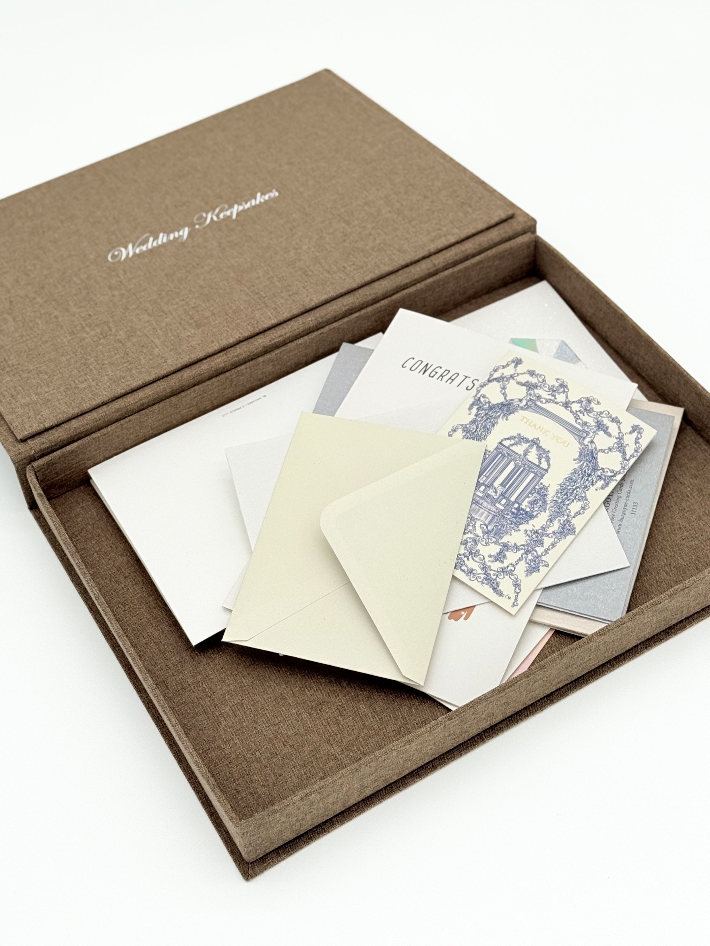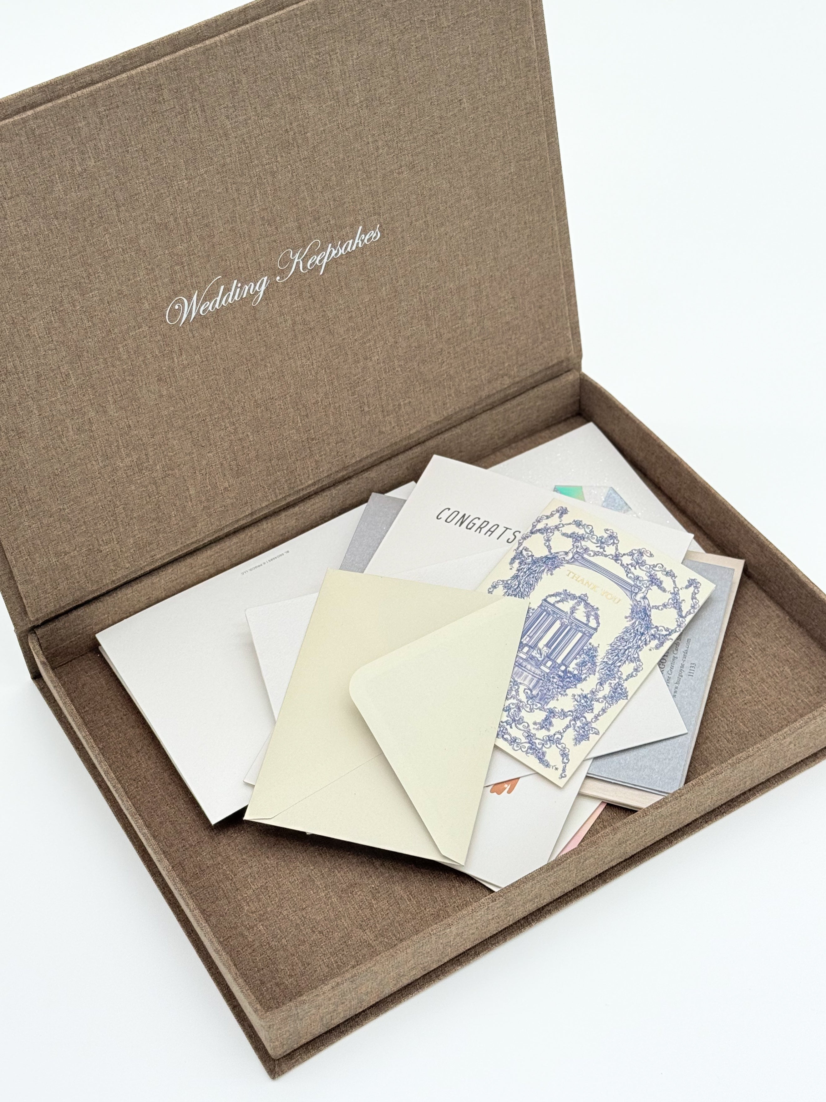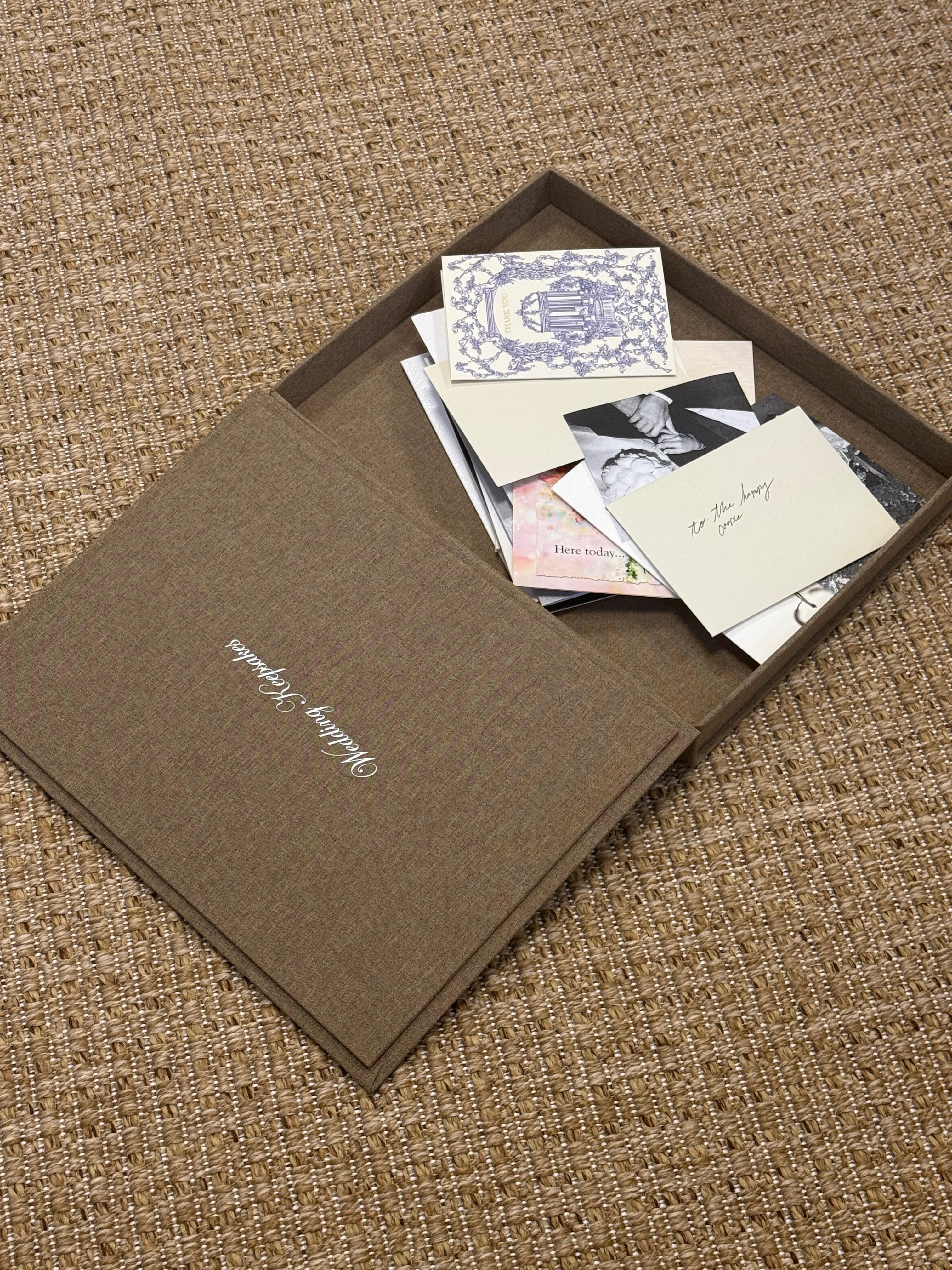 Thoughtfully designed to hold your most meaningful wedding memories, this linen book box is the perfect place to store the letters and cards from your guests. It’s a beautiful way to keep their words of love, advice, and celebration safe—and something you’ll treasure for years to come.